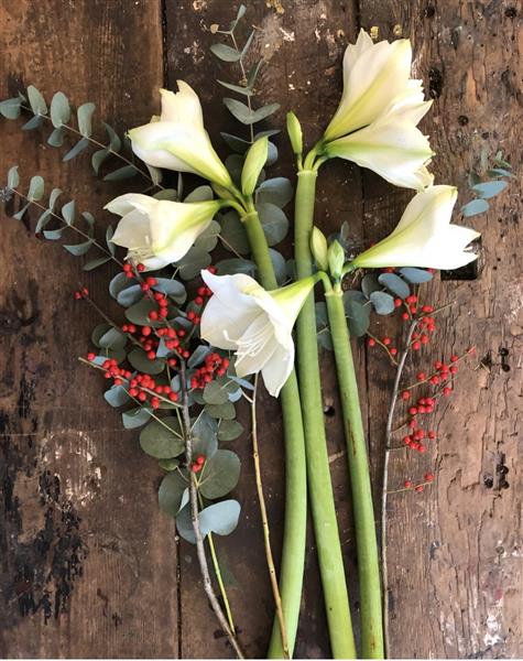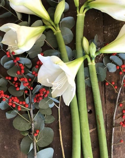 WHITE AMARYLLIS WITH MIXED SEASONAL FOLIAGE