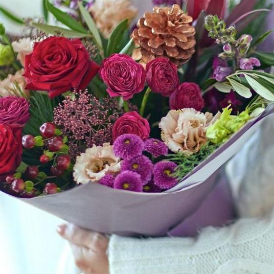 A Beautiful Festive Handtied of mixed seasonal flowers and scented foliage stylishly arranged by our expert florists and delivered in water.